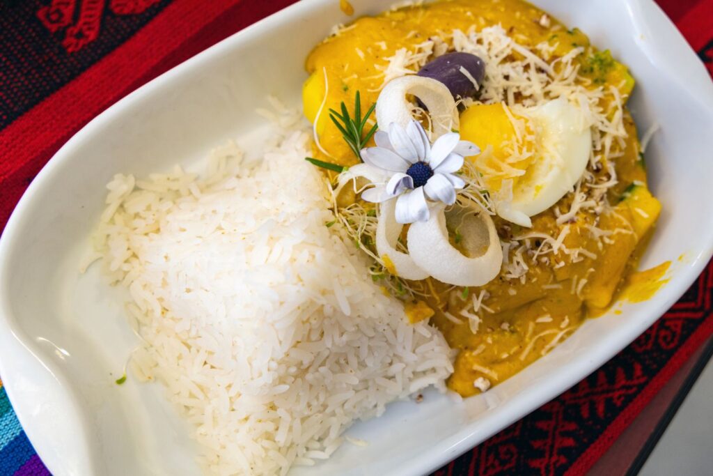 This dish features the Andean chili pepper, ají. The pepper’s flavor is rich and it serves as an ingredient in almost all traditional sauces, marinades, and sofritos in Peruvian cooking. Ají de Gallina (gallina means hen) is made with a creamy sauce made from yellow ají pepper, onions, garlic, a fresh and tangy goat or cow’s cheese, evaporated milk, and it is thickened with blended soda crackers. The sauce is poured over shredded chicken and served over rice, with a side of boiled potatoes, a few olives, and a hard boiled egg.